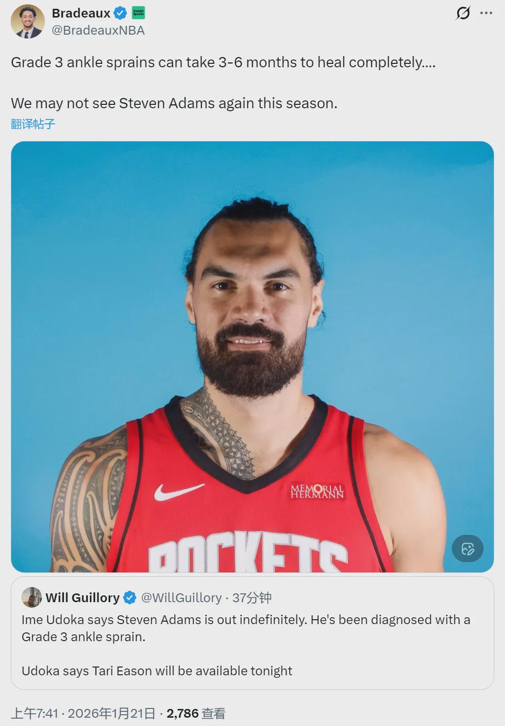 北京时间1月21日上午,火箭将在主场对阵马刺。据火箭随队记者Bradeaux报道,赛前火箭主帅乌度卡透露,球队中锋史蒂文-亚当斯遭遇了脚踝三级扭伤,将无限期休战。脚踝扭伤通常分为三个级别,三级扭伤是最严重的一档。